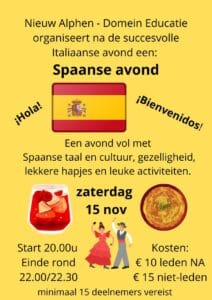Na het succes van de Italiaanse avond, organiseert domein Educatie nu een Spaanse variant! De kennis van de Spaanse taal is groot binnen het domein en dit wordt natuurlijk graag gedeeld. Een avond vol met taal en cultuur, gezelligheid, lekkere hapjes en leuke activiteiten. Zien we zaterdag 15 november? Hasta luego!